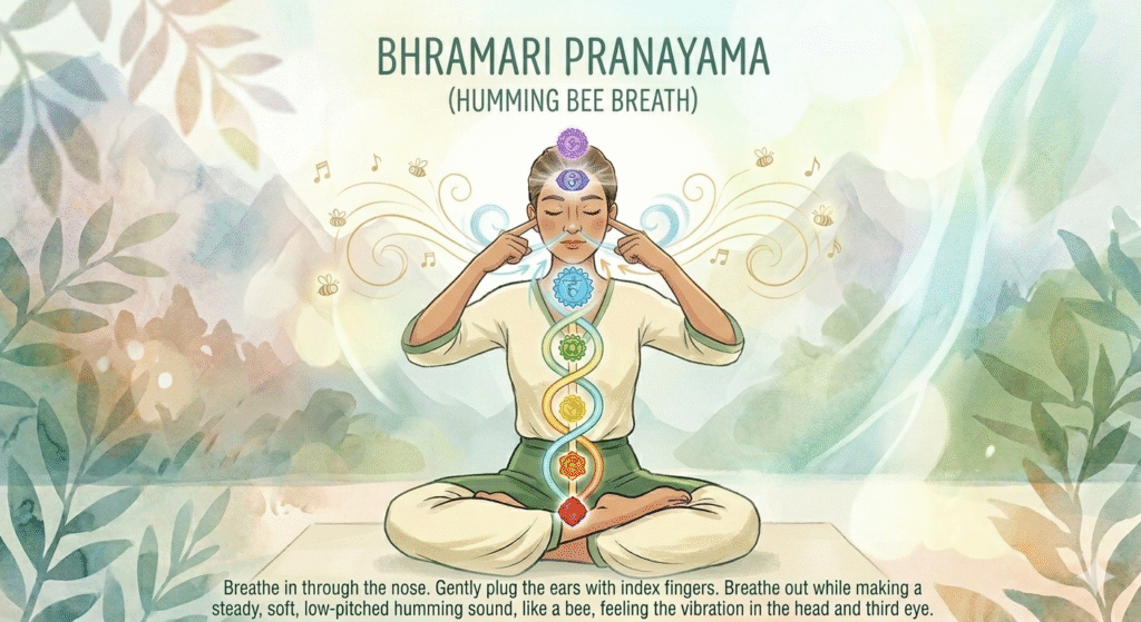 3. Bhramari (Humming Bee Breath): A powerful practice for calming anxiety and quieting mental chatter. By humming on the exhale, you create a vibrational effect that soothes the nervous system almost instantly.