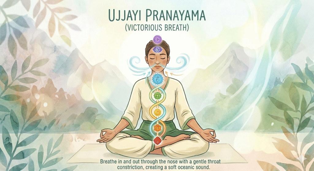 2. Ujjayi (Victorious Breath): Often called the “ocean breath,” this technique involves a gentle constriction at the back of the throat, creating a soft, rhythmic sound. It builds internal heat, anchors attention, and is commonly used during yoga practice.